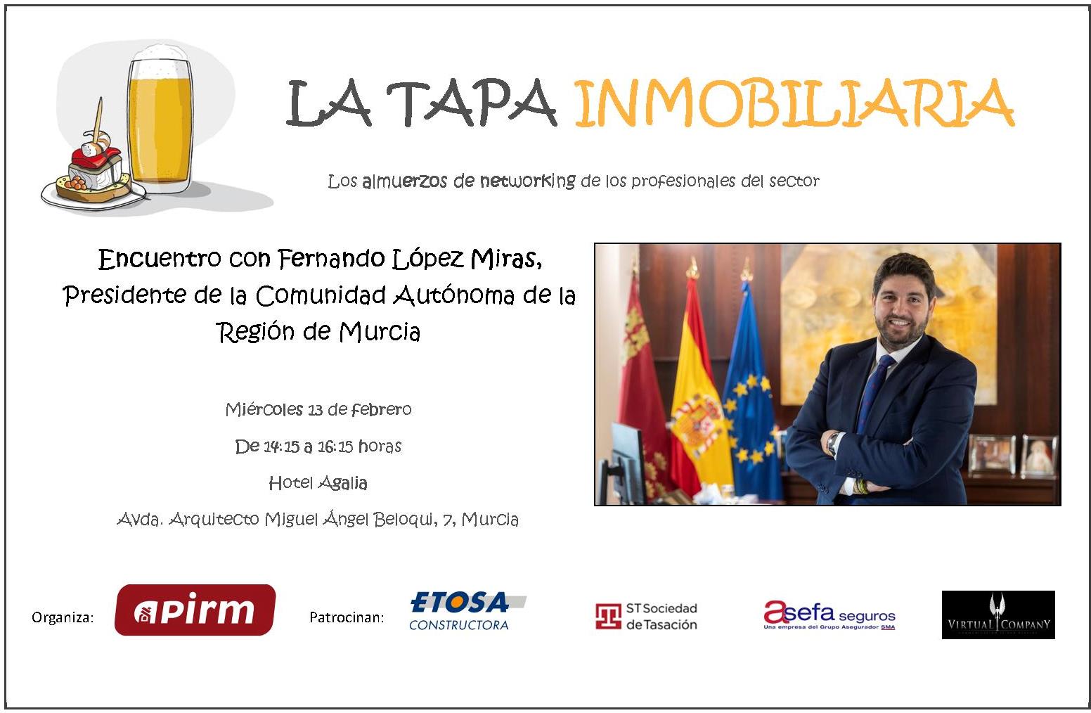 Para abrir el ciclo de actos que tenemos previstos para celebrar el 40º aniversario de APIRM hemos preparado una Tapa Inmobiliaria con un invitado muy especial. En esta ocasión, contaremos con la presencia de Fernando López Miras, Presidente regional, que vendrá a desgranarnos cuáles son los retos actuales de la empresa murciana y las reformas y los proyectos pendientes para la Región.